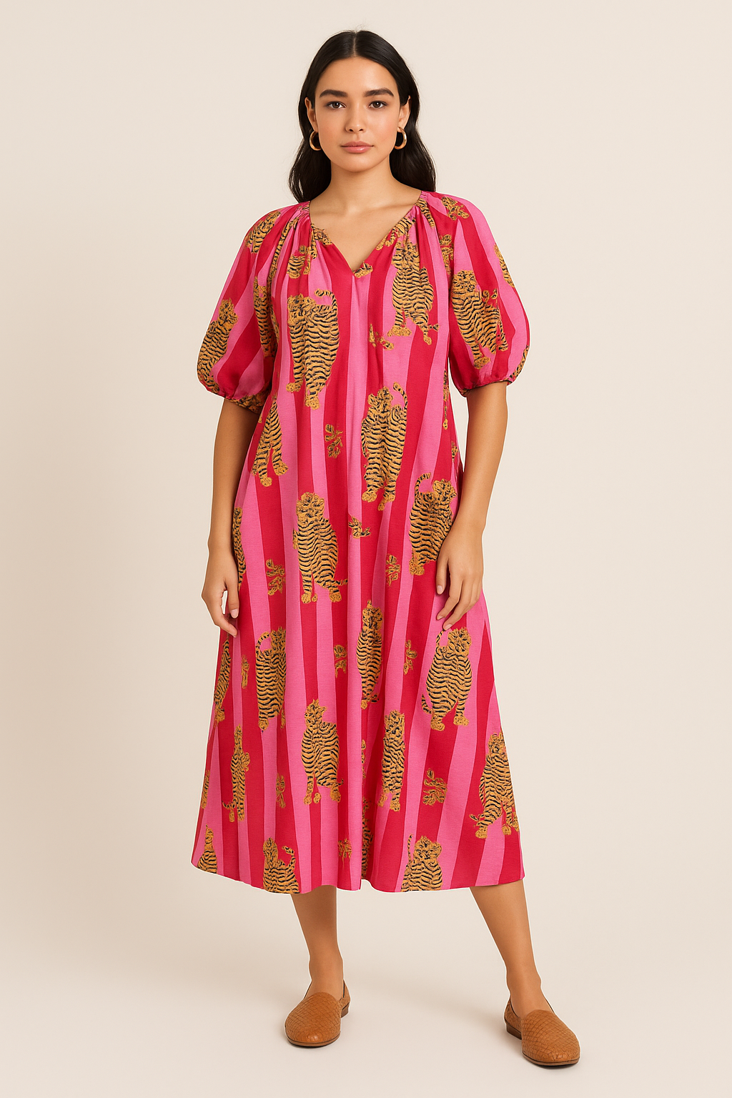 Every piece begins where sunlight, tradition, and skilled hands meet. Intricate wooden blocks are pressed into breathable cotton, allowing each print to unfold slowly and naturally. The fabric is then air-dried, giving it time to settle and soften. From there, each garment is carefully constructed, blending prints with purpose to create something singular—rooted in history and made with patience, care, and heart.